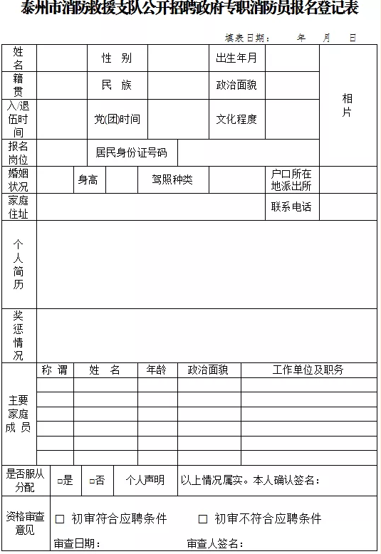 點(diǎn)擊下載:泰州市消防救援支隊(duì)政府專職消防隊(duì)員招聘報(bào)名表